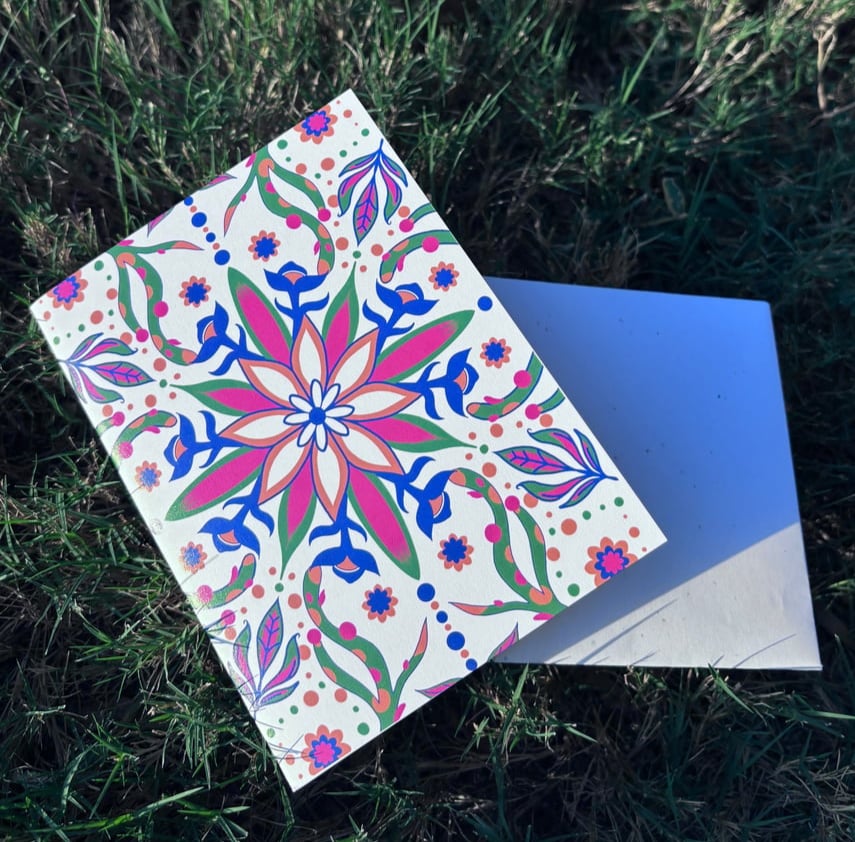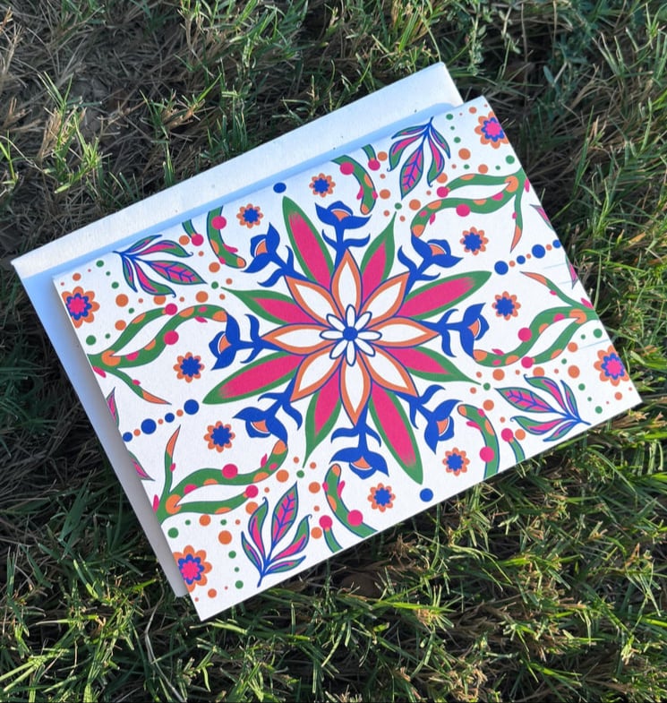 Floral Intake notecard. Playful elements involved around the center of the floral opening.